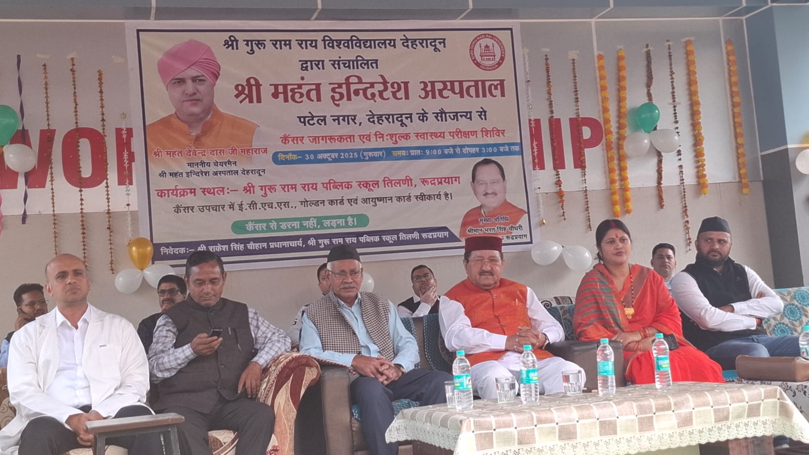 देहरादून। श्री गुरु राम राय विश्वविद्यालय एवम् श्री महंत इन्दिरेश अस्पताल, देहरादून के सौजन्य से श्री गुरु राम राय पब्लिक स्कूल, तिलणी, रुद्रप्रयाग में गुरुवार, 30 अक्टूबर 2025 को कैंसर जागरूकता एवं निःशुल्क स्वास्थ्य परीक्षण शिविर का सफल आयोजन किया गया। इस अवसर पर 2100 से अधिक मरीजों ने शिविर का लाभ उठाया। शिविर में अस्पताल के विशेषज्ञ चिकित्सकों ने स्वास्थ्य परामर्श दिया तथा रोगियों को निःशुल्क दवाइयाँ वितरित की गईं।