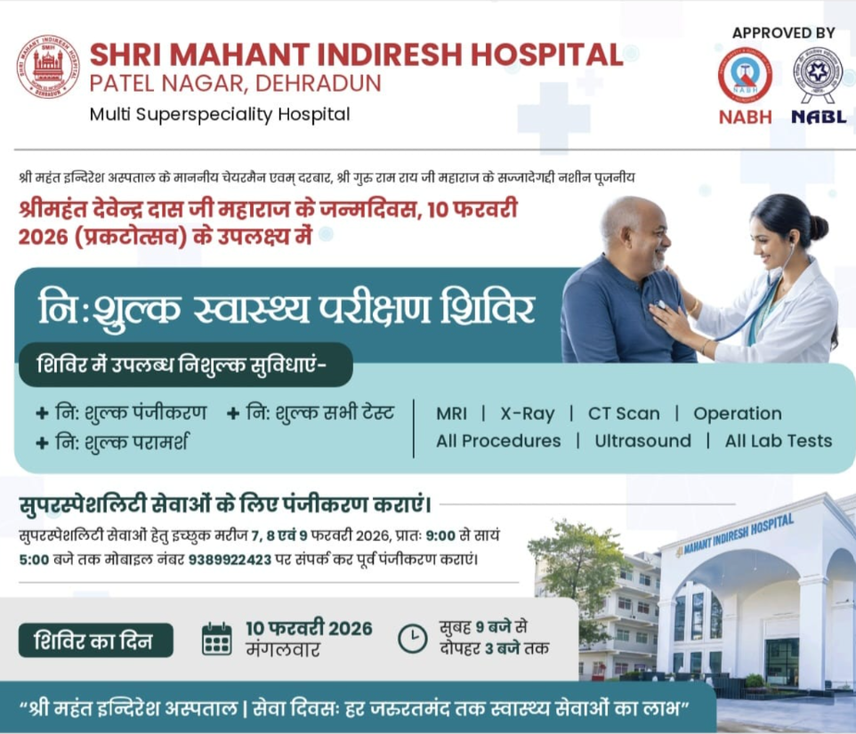 देहरादून। दरबार श्री गुरु राम राय जी महाराज के सज्जादे गद्दी नशीन एवं पूजनीय श्रीमहंत देवेन्द्र दास जी महाराज के जन्मदिवस (प्रकटोत्सव 10 फरवरी) के पावन अवसर पर श्री महंत इन्दिरेश अस्पताल, देहरादून द्वारा 10 फरवरी 2026 (मंगलवार) को एक विशाल निःशुल्क स्वास्थ्य परीक्षण शिविर का आयोजन किया जा रहा है, जिसे इस वर्ष सेवा दिवस के रूप में श्रद्धा, सेवा और समर्पण की भावना के साथ मनाया जाएगा। इस शिविर में जनरल चिकित्सा सेवाओं के साथ-साथ सभी सुपरस्पेशलिटी सेवाएं भी पूर्णतः निःशुल्क उपलब्ध कराई जाएंगी। शिविर के लिए पंजीकरण सुबह 08 बजे से प्रारंभ होगा, जबकि मरीज सुबह 09 बजे से दोपहर 03 बजे तक स्वास्थ्य सेवाओं का लाभ ले सकेंगे।